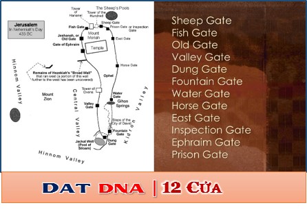 Nêhêmi chương 3 mô tả những người thợ lo tái thiết bức tường quanh thành Jerusalem. Bức tường có 12 cổng. 12 cổng nầy mô tả cách ăn ở Cơ đốc từ đầu cho đến cuối: